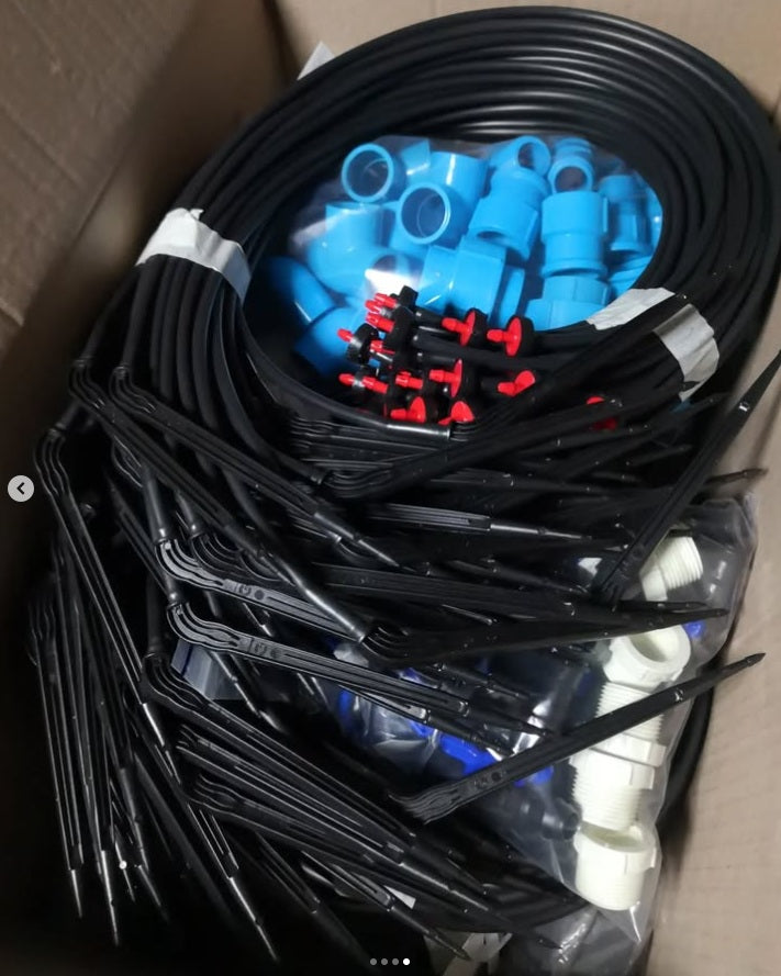 - Kit de mesa: contiene todos los fittings necesarios para distribuir las salidas a las plantas. Compuesto de polietileno de 1/2" (16 mm) - El sistema está diseñado para unir el PVC y el PE mediante una manguera de 3/4. Esta manguera debes comprarla por tu cuenta e idealmente no debe ser transparente.